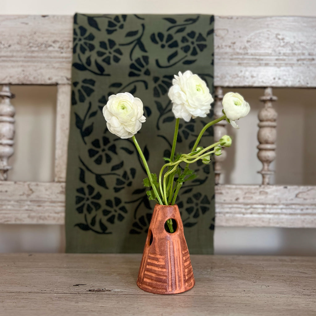 Hand thrown and hand carved stoneware. 5" tall. Assorted colors.